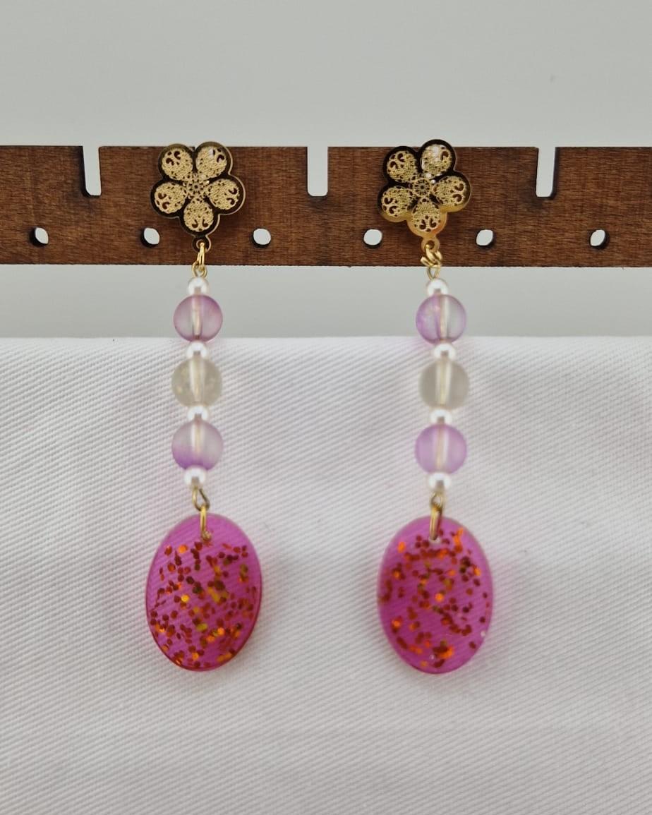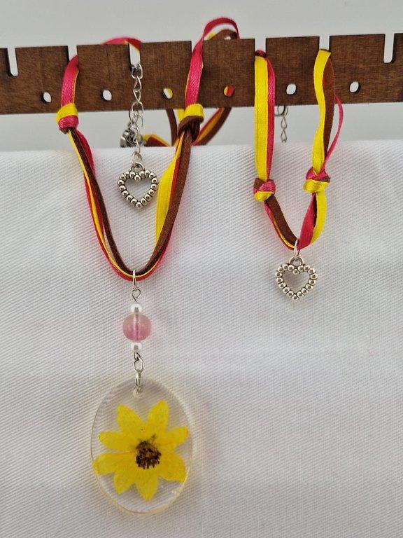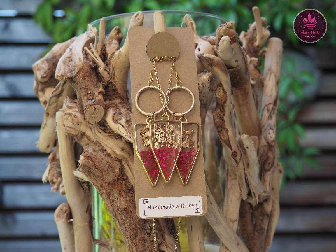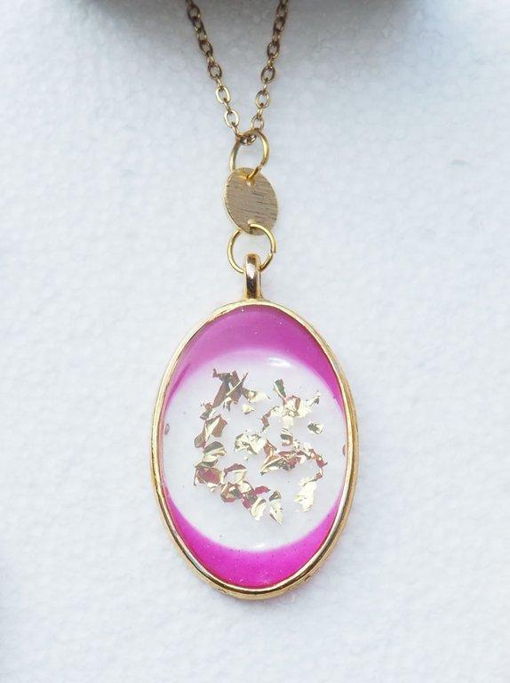 Pink Dream – Halskette mit Goldflocken. Ein strahlender Blickfang: Der ovale Anhänger leuchtet in kräftigem Pink, das sanft zum klaren Zentrum ausläuft. In der Mitte schweben feine Goldflocken, die im Licht dez...